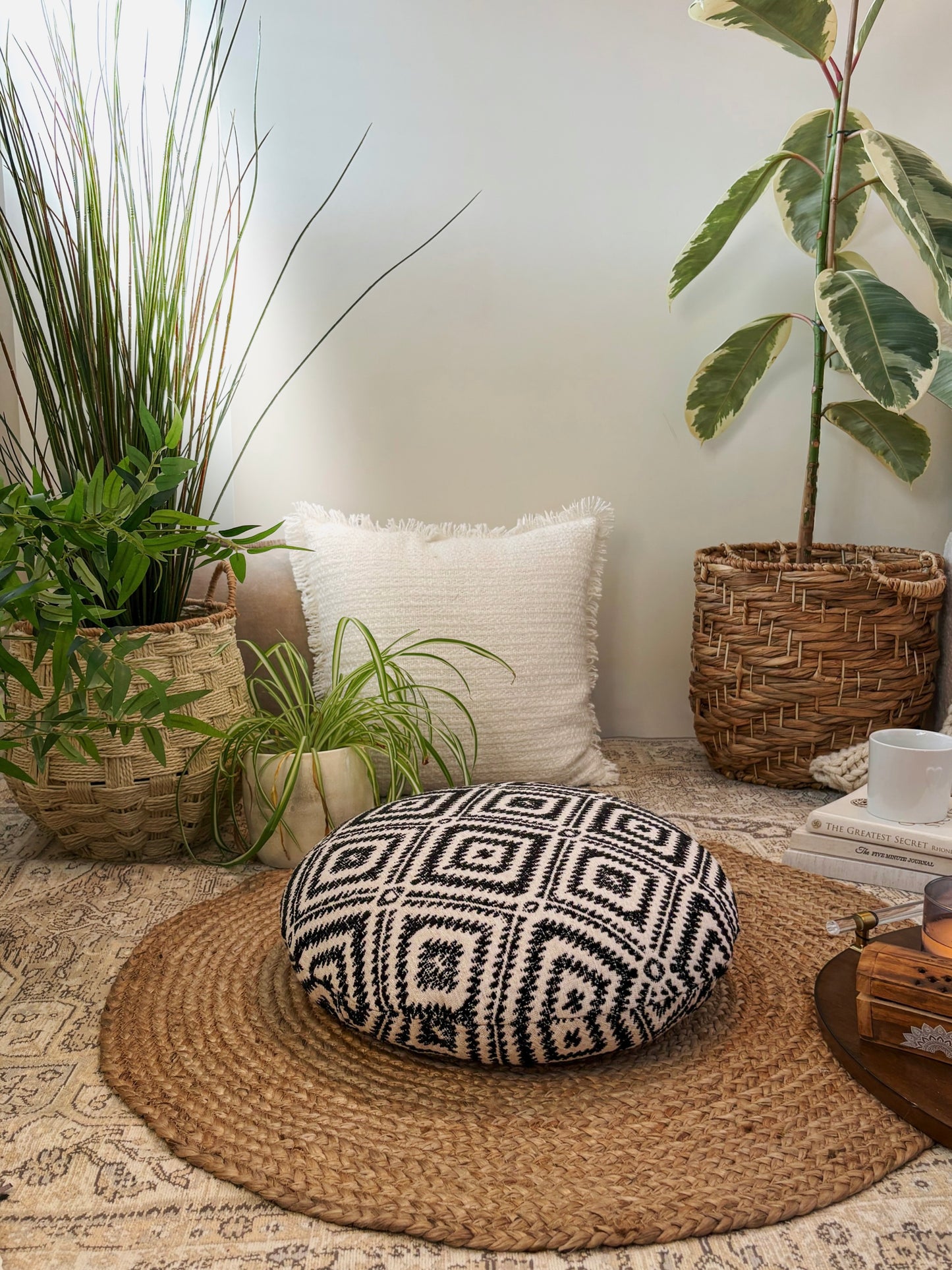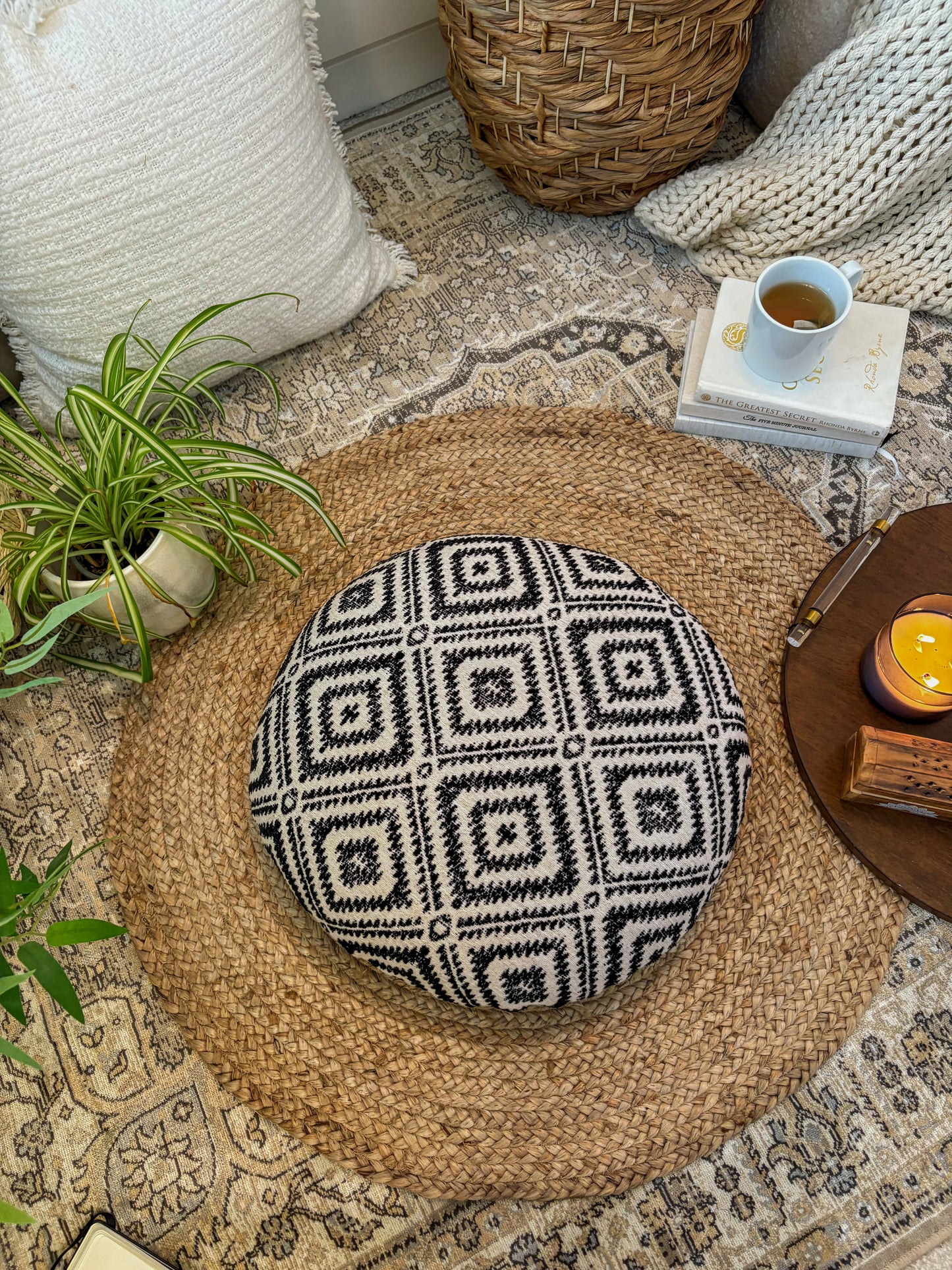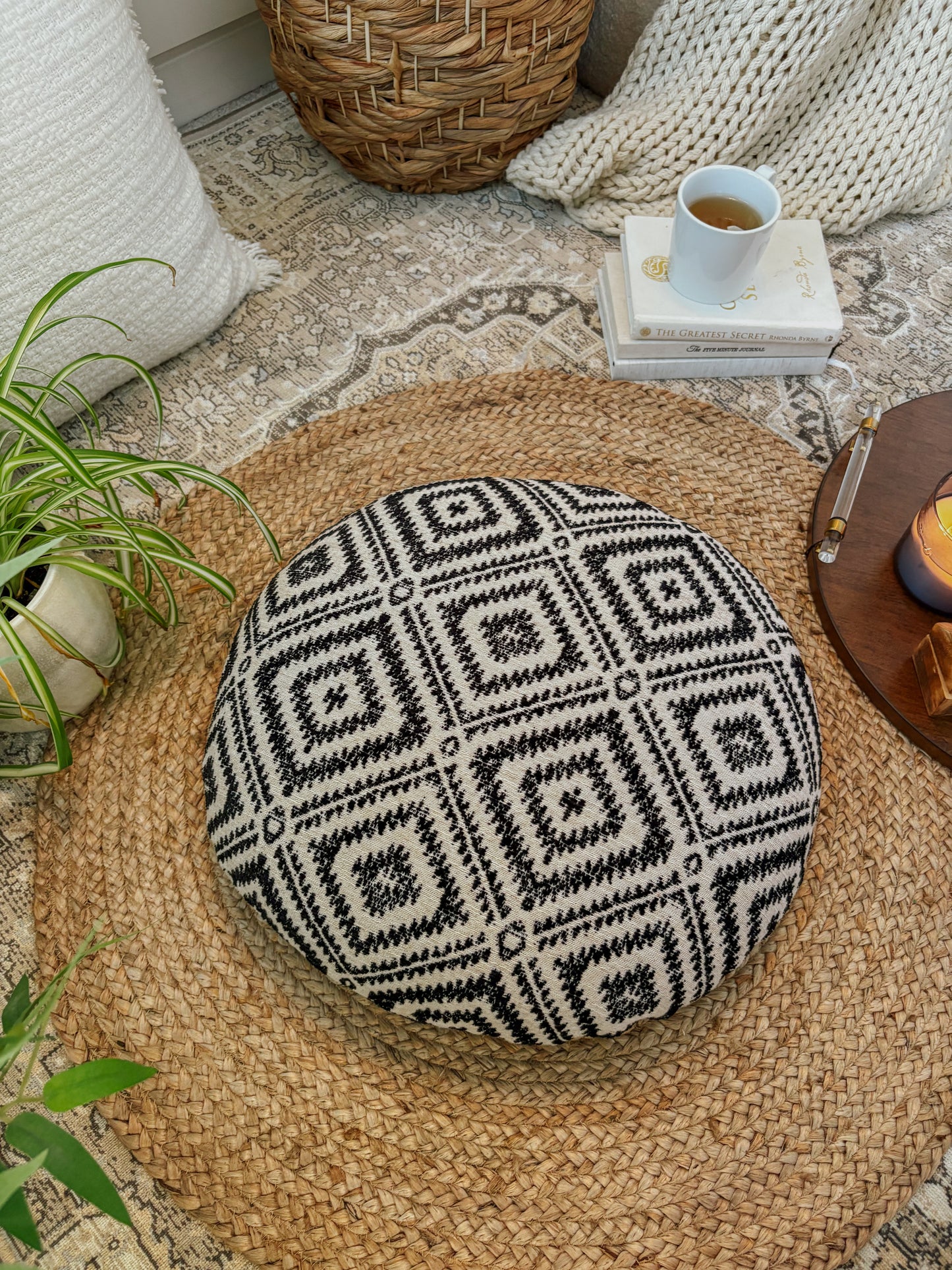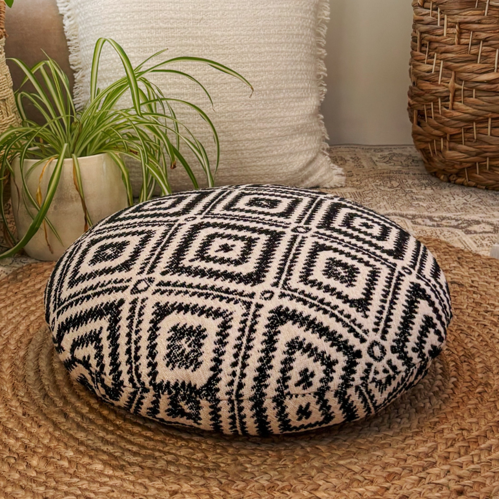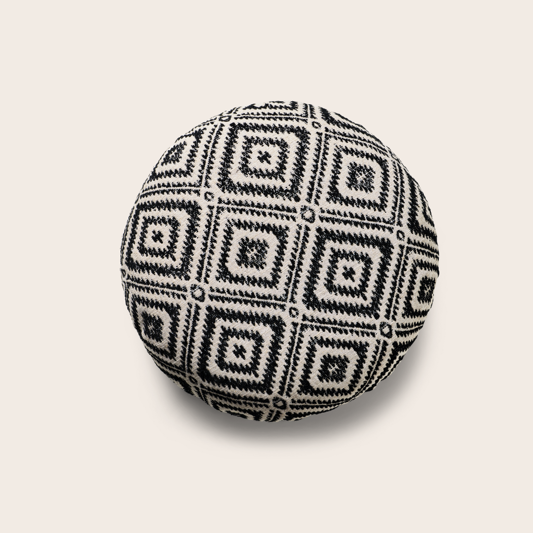 A luxury meditation cushion handmade in the UK from recycled textiles. Inspired by the courtyards of Marrakech, this cushion captures the balance between earthy grounding and artistic boldness. Its black-and-cream diamond weave design draws the eye, creating a striking focal point in any calm corner.